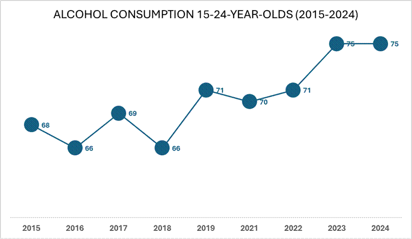 However, while drinking among young people declined from the mid-2000s to the mid-2010s, since 2015, that downward trend has reversed with consumption by 15–24-year-olds increasing from 66% in 2018 to 75% in 2024.